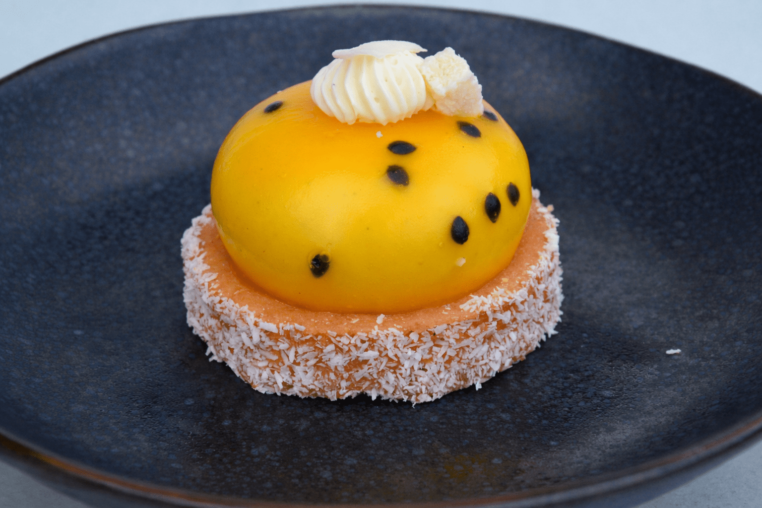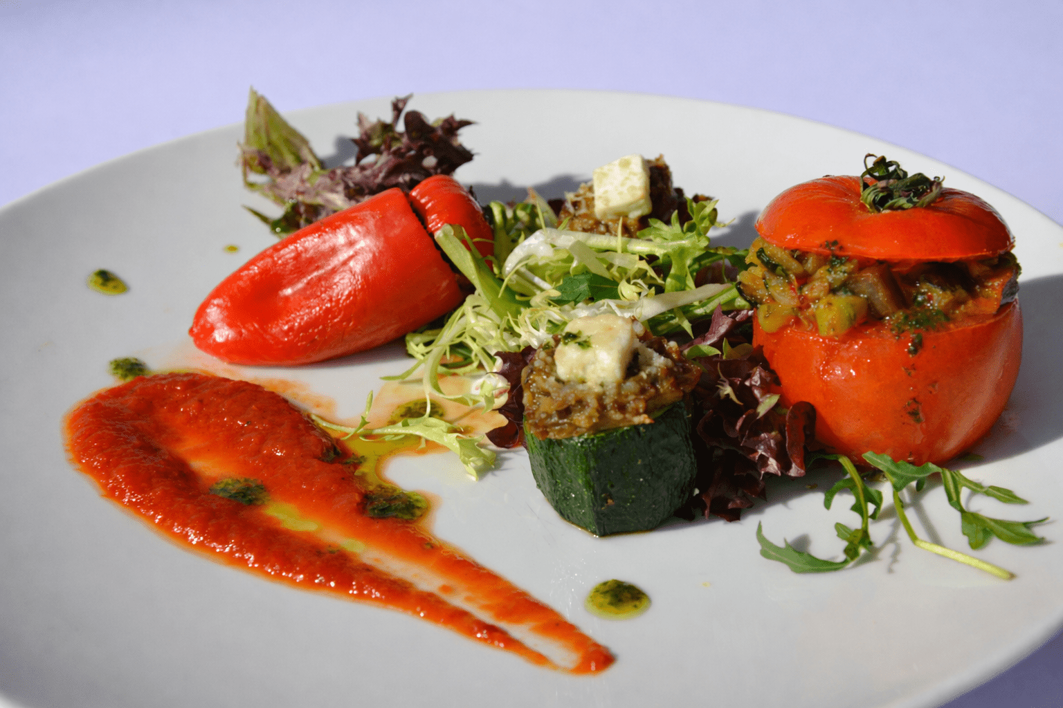 • Piccoli ortaggi ripieni — peperone, pomodoro, zucchina e melanzana — su coulis di pomodoro fresco con un tocco di pistou e bouquet di erbe aromatiche