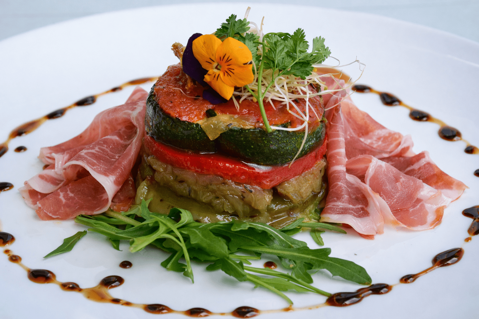 • Pressato di verdure confit con profumi di Provenza, servito con prosciutto San Daniele e vinaigrette al balsamico